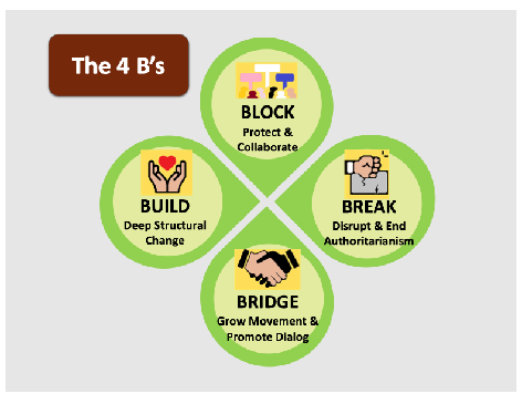 There are many things to do to support democracy and resist fascism. The UUSJ outlines “the 4 B’s” as categories to work on: