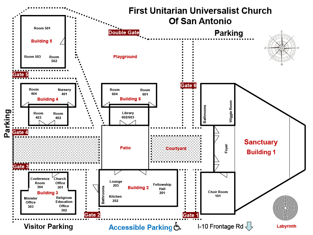 If you are traveling east on Loop 410, take the Fredericksburg Road exit. Stay on the access road, cross Fredericksburg Road, and follow the access road which curves to the right around the side of Wonderland of the Americas Mall (formerly Crossroads). Do not take the ramp to the left which will put you back on 410. As you approach Crossroads Blvd take the turnaround to the left under the highway. Go past the gas station and the motel and head up the hill. The church is at the top of the hill on the right.